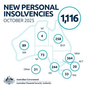Australian Financial Security Authority (AFSA) AFSA’s latest provisional statistics show 1,116 Australians entered personal insolvency in October, down from 1,169 in September and higher than 1,009 in October last year.